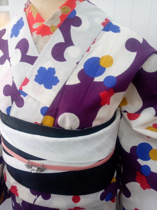 朱赤の半襟が艶やかさを、白黒の帯がオトナの雰囲気を演出します。